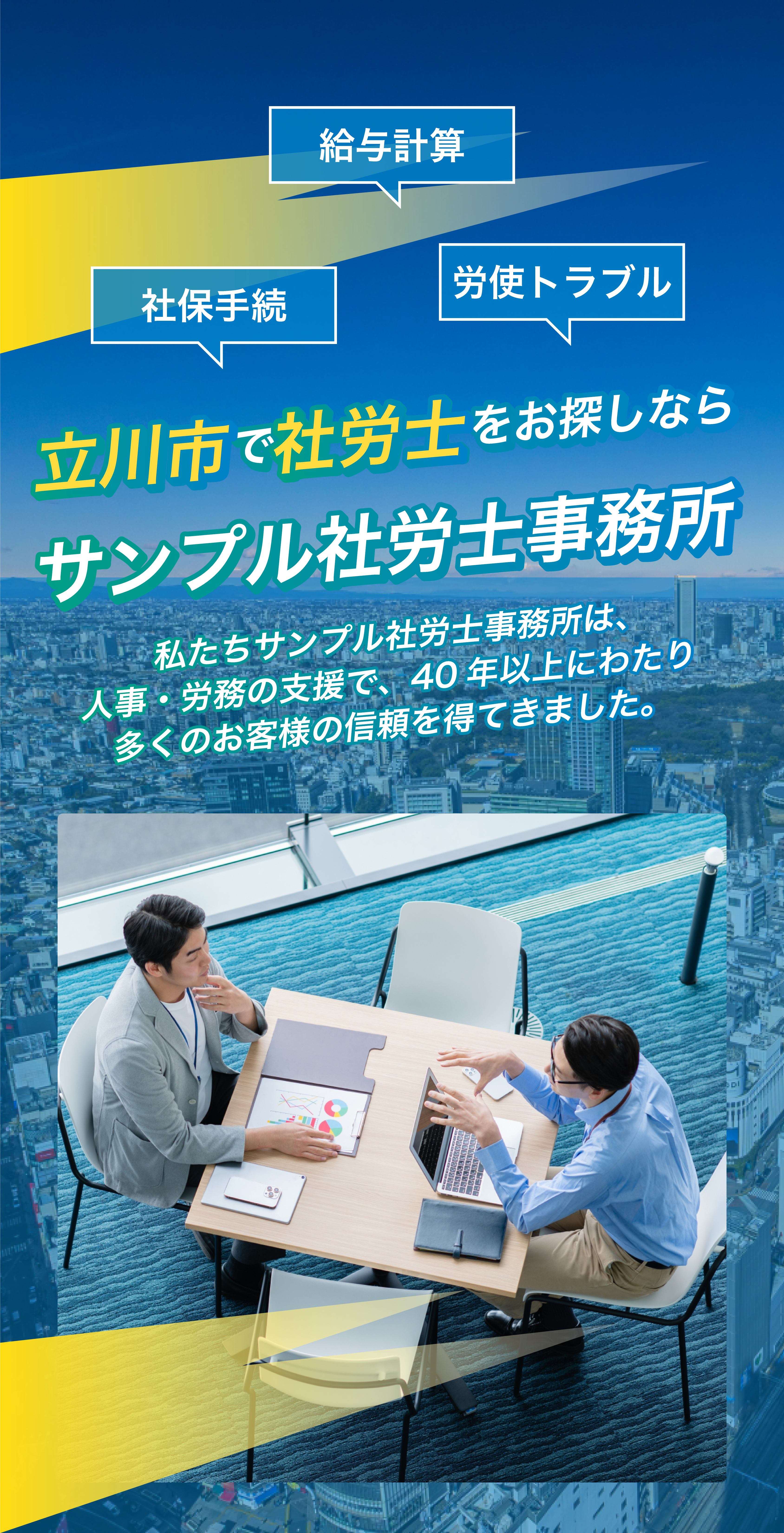私たちサンプル社労士事務所は、1980年の創業以来、40年以上にわたり、確かな専門知識と誠実なサービスで、多くのお客様の信頼を得てきました。